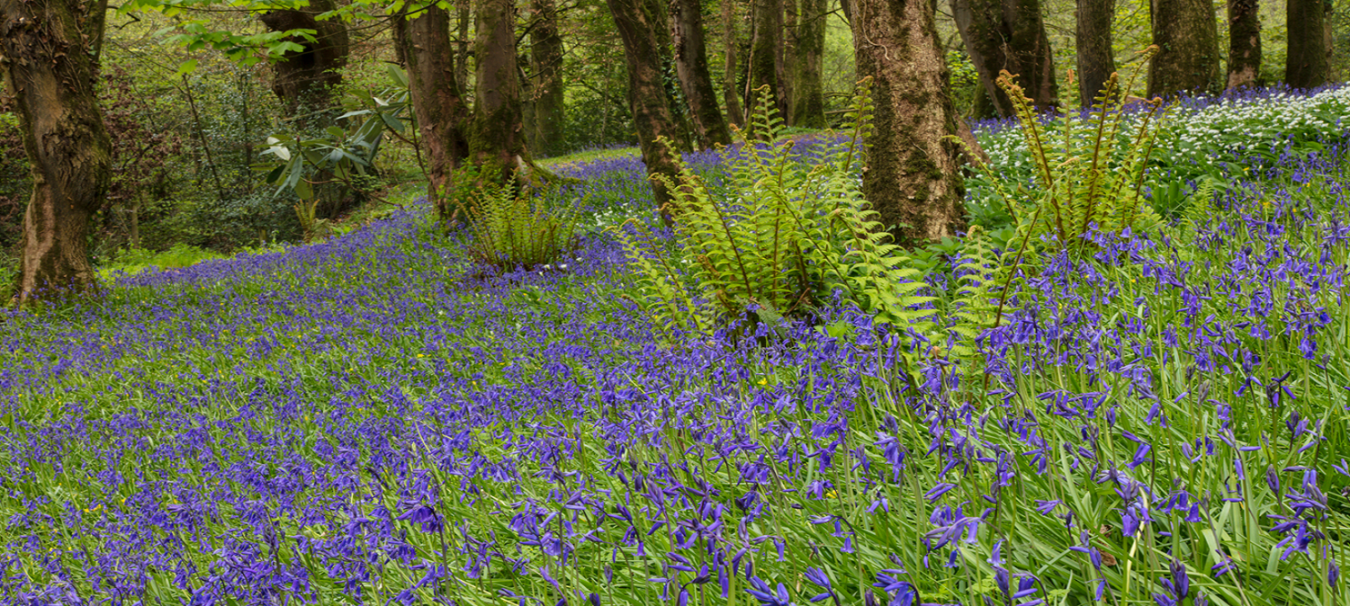 Rhwng diwedd mis Mawrth a mis Mai mae llawr y goedwig yn troi'n las ac mae arogl hyfryd miloedd o glychau'r gog prydferth yn llenwi'r aer.