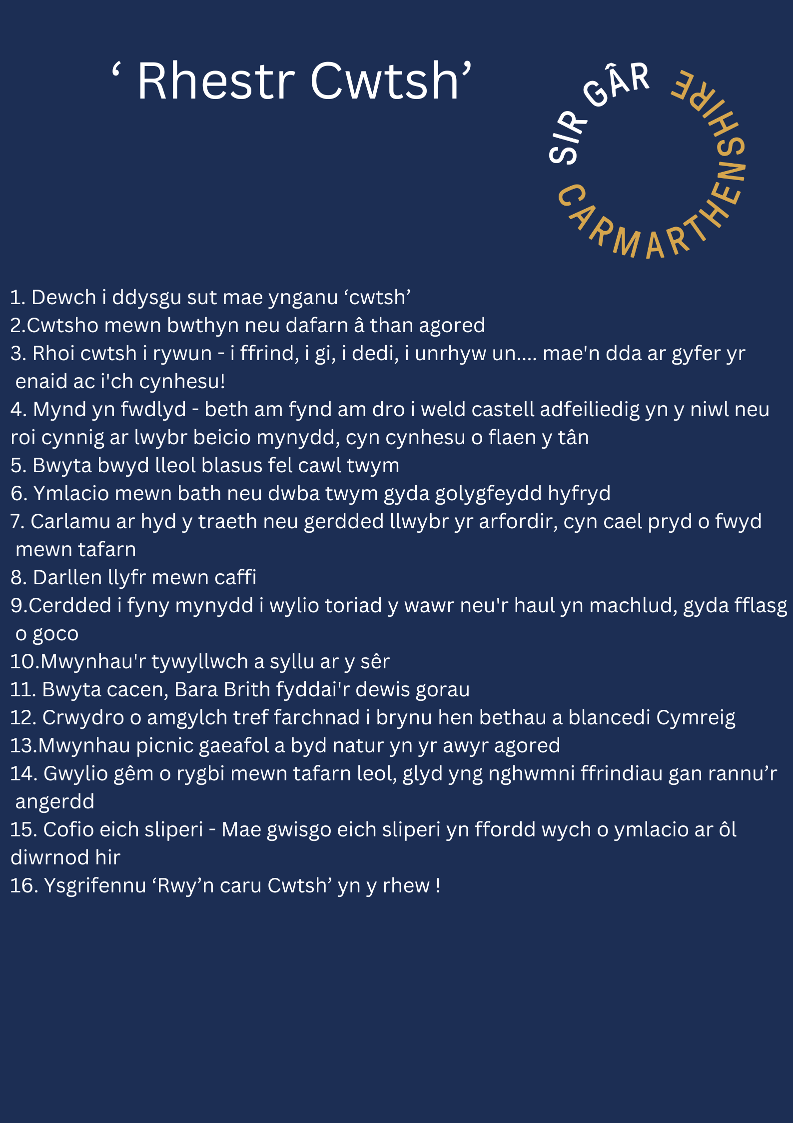 Mae ein canllaw Cwtsho lan yn Sir Gâr yn rhoi syniadau ar gyfer sut i drefnu gwyliau perffaith dros y gaeaf lle cewch brofiadau i lonni'r galon, mwynhau golygfeydd trawiadol ac anturiaethau yn yr awyr agored, ac i ddilyn, bwyd blasus wrth dân agored.