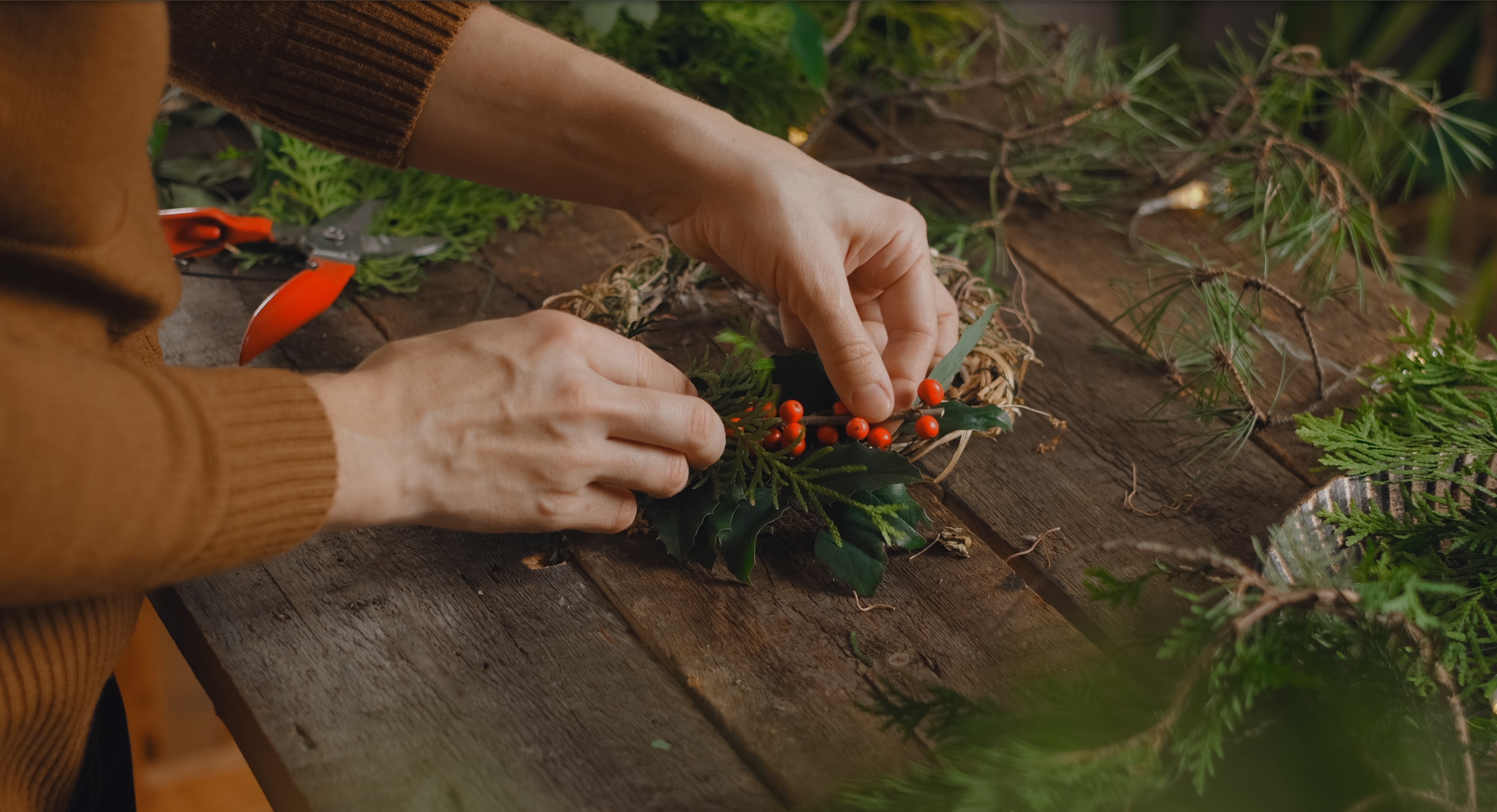 Ewch i fwynhau ychydig o oriau Nadoligaidd yn Llety Cynin er mwyn creu eich torch Nadolig hardd eich hun yn llawn aroglau pinwydd a gwyrddni. Mae'r pris yn cynnwys yr holl ddeunyddiau naturiol ynghyd â gwydraid o win twym a mins pei.